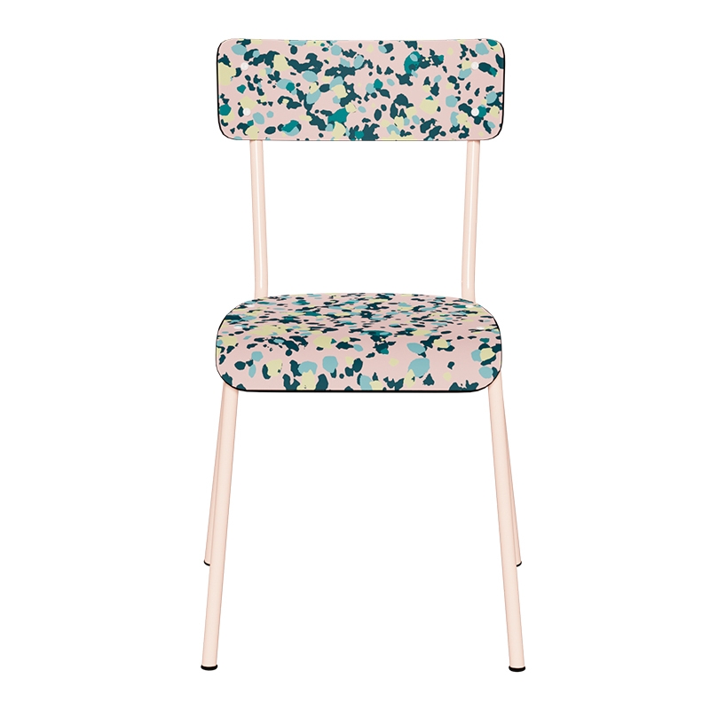 Chaise d’écolier Adulte Suzie en formica – Dossier & imprimé Minéral Bleu - pieds rose poudré